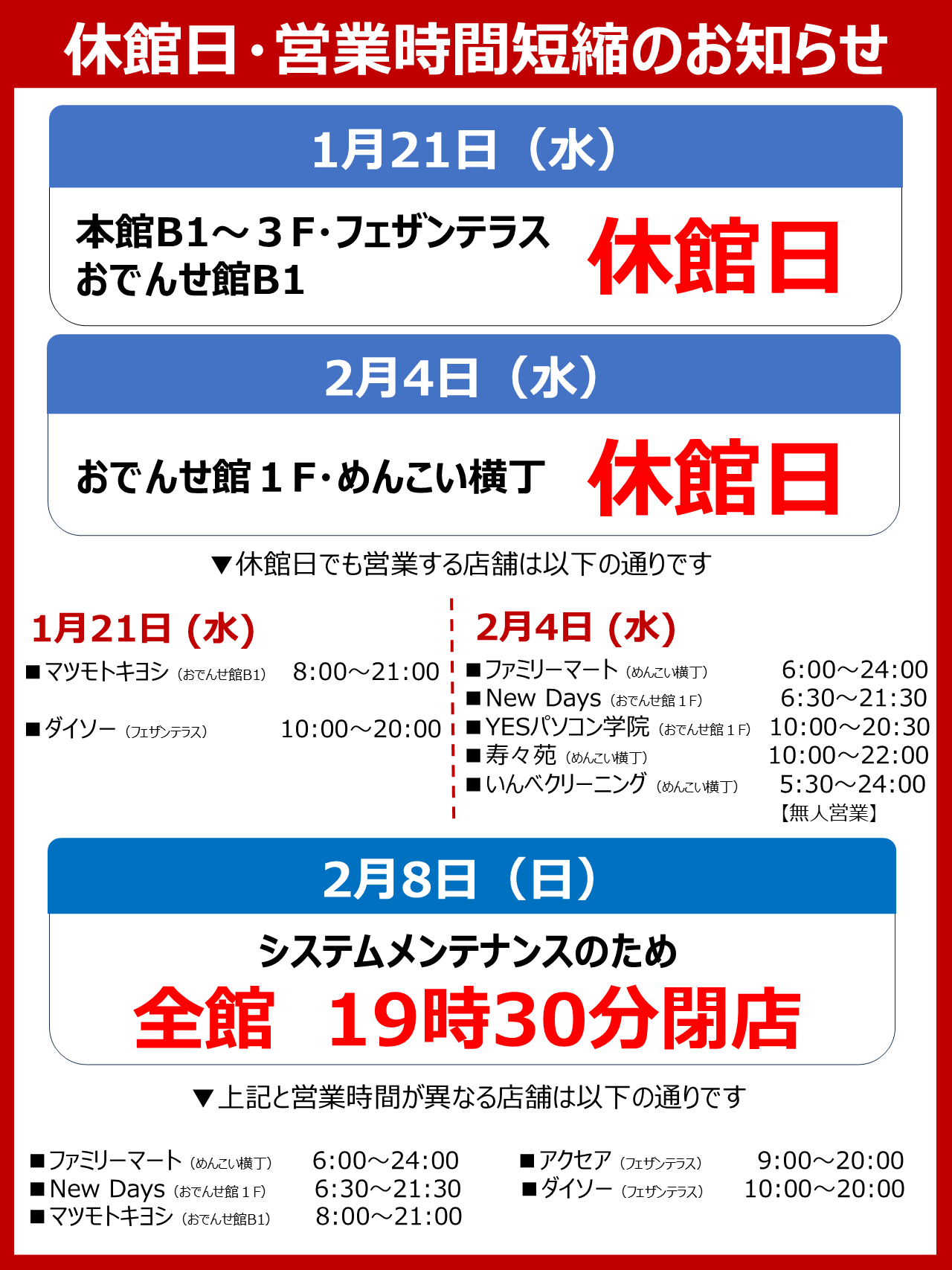 本館B1〜3F・フェザンテラス・おでんせ館B1 休館日