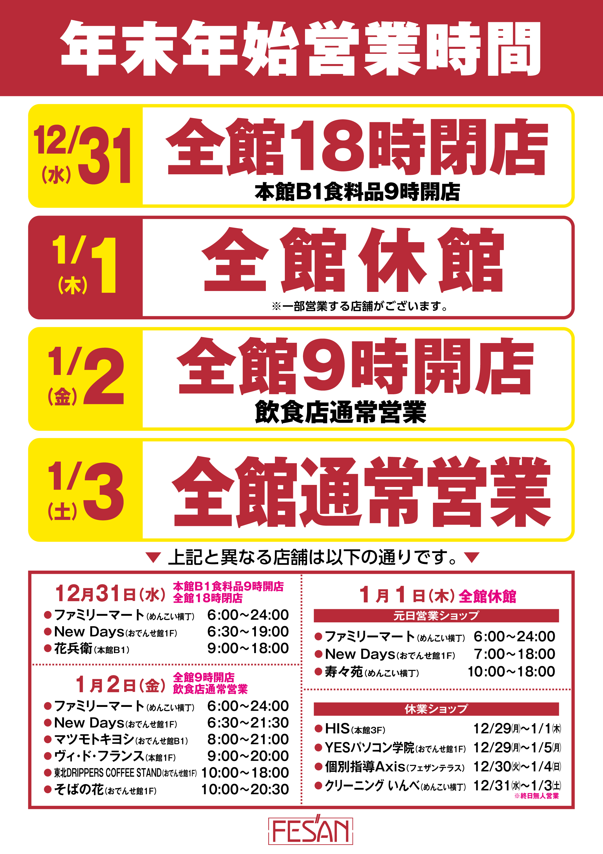 本館・フェザンテラス ●ファッション館(1〜3F) 10:00〜20:00 ●B1 10:00〜20:30 ●B1レストラン 11:00〜21:30