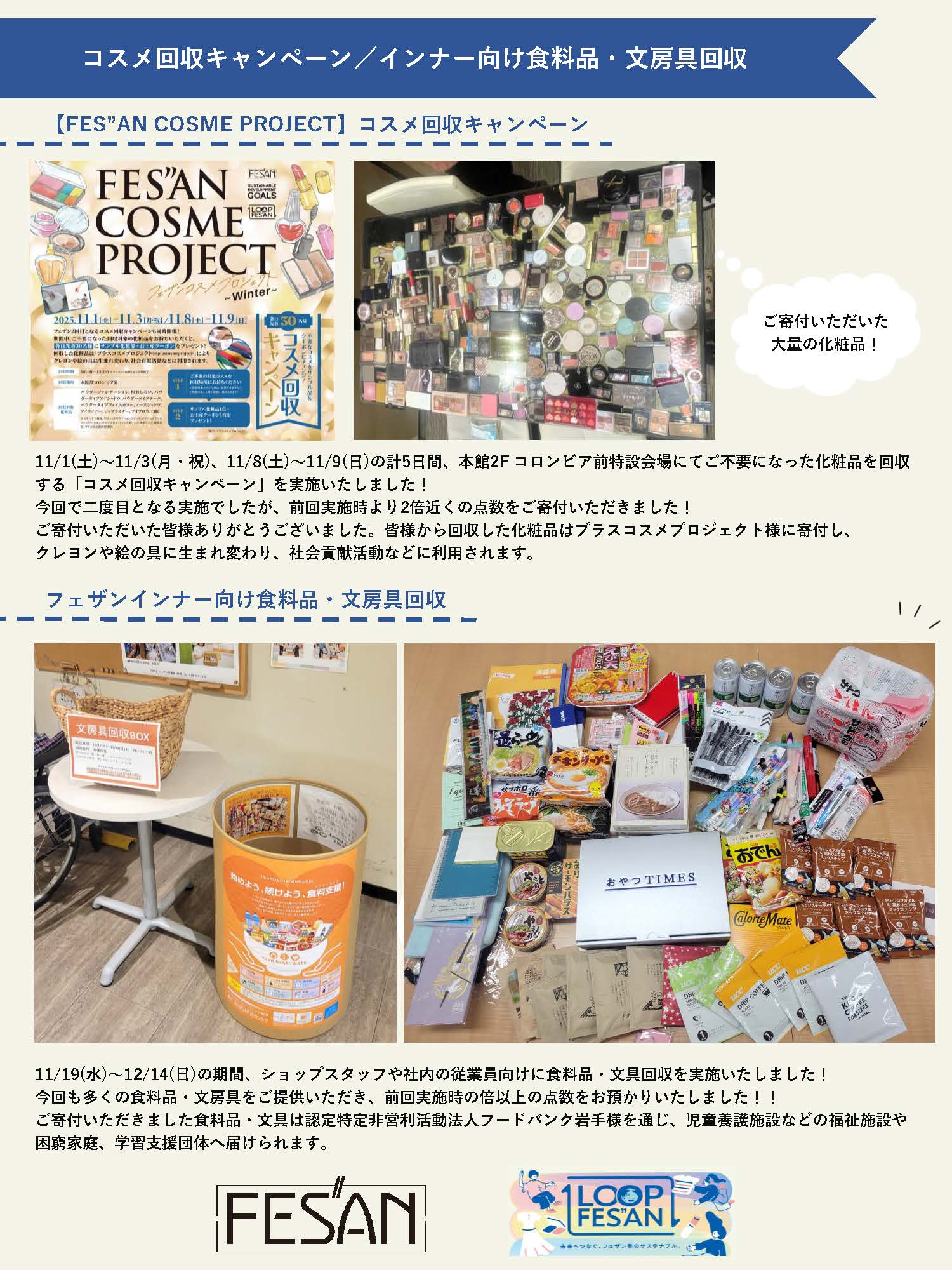 フェザンでは、ひとりひとりがアクションを起こすことで、よりよい未来を創っていく「FES"AN ACTION PROJECT」を2023年1月に始動しました。 アパレル問題、フードロス、環境など身近な問題をテーマに取り上げ、サステナブルな未来をフェザンとお客さまと一緒に考えてまいります。 フェザンショップや地域企業とともに様々な形で、小さなことから大きなことまで、フェザンからよりよい未来に向けたアクションを起こしていきます。