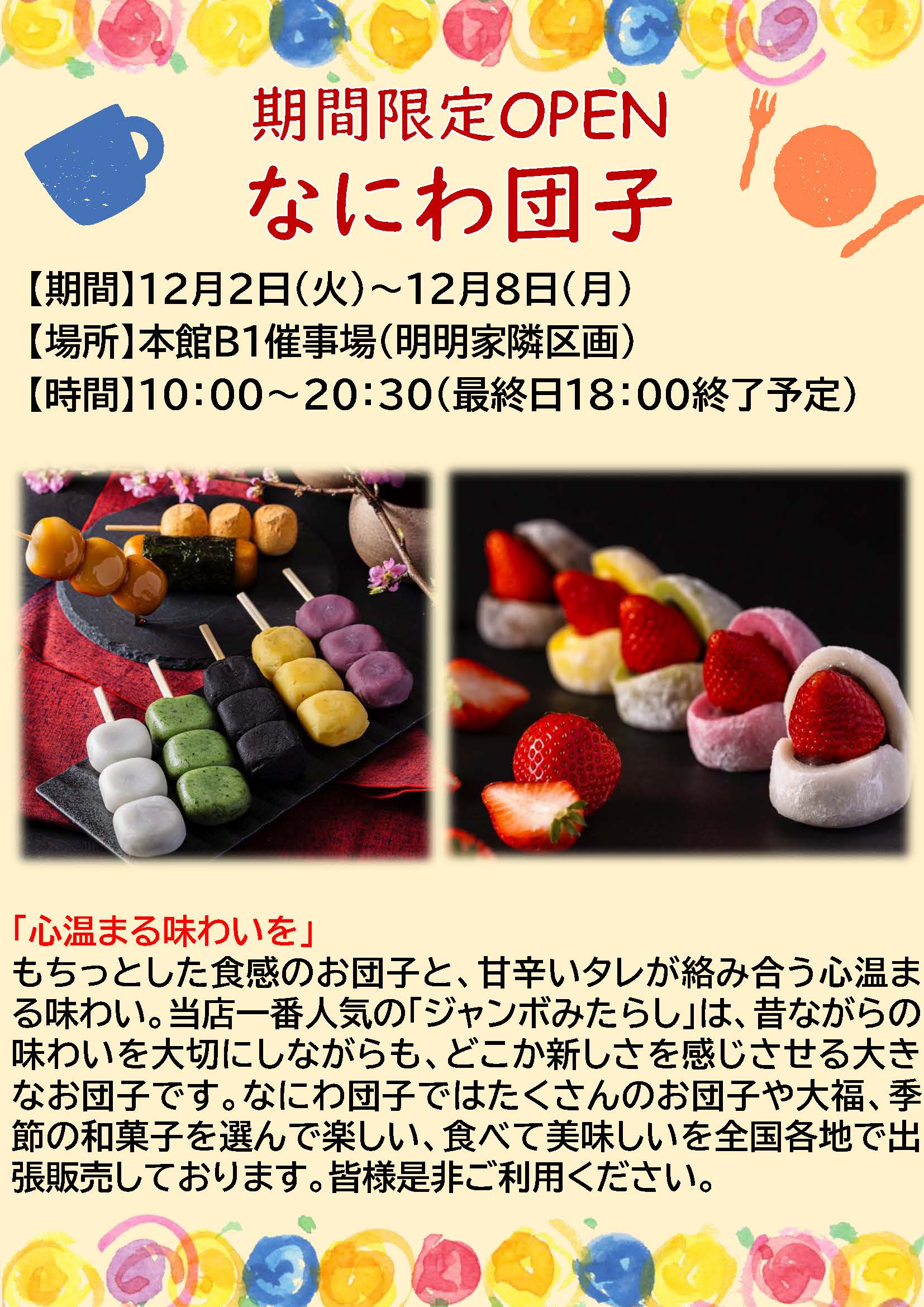 なにわ団子ではたくさんのお団子や大福、季節の和菓子を選んで楽しい、食べて美味しいを全国各地で出張販売しております。