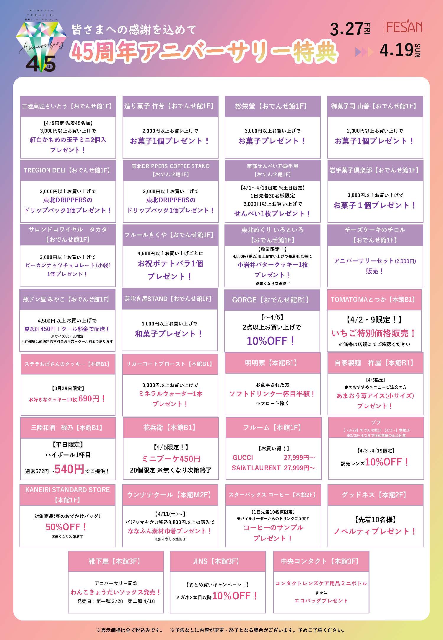 本館・フェザンテラス ●ファッション館(1〜3F) 10:00〜20:00 ●B1 10:00〜20:30 ●B1レストラン 11:00〜21:30