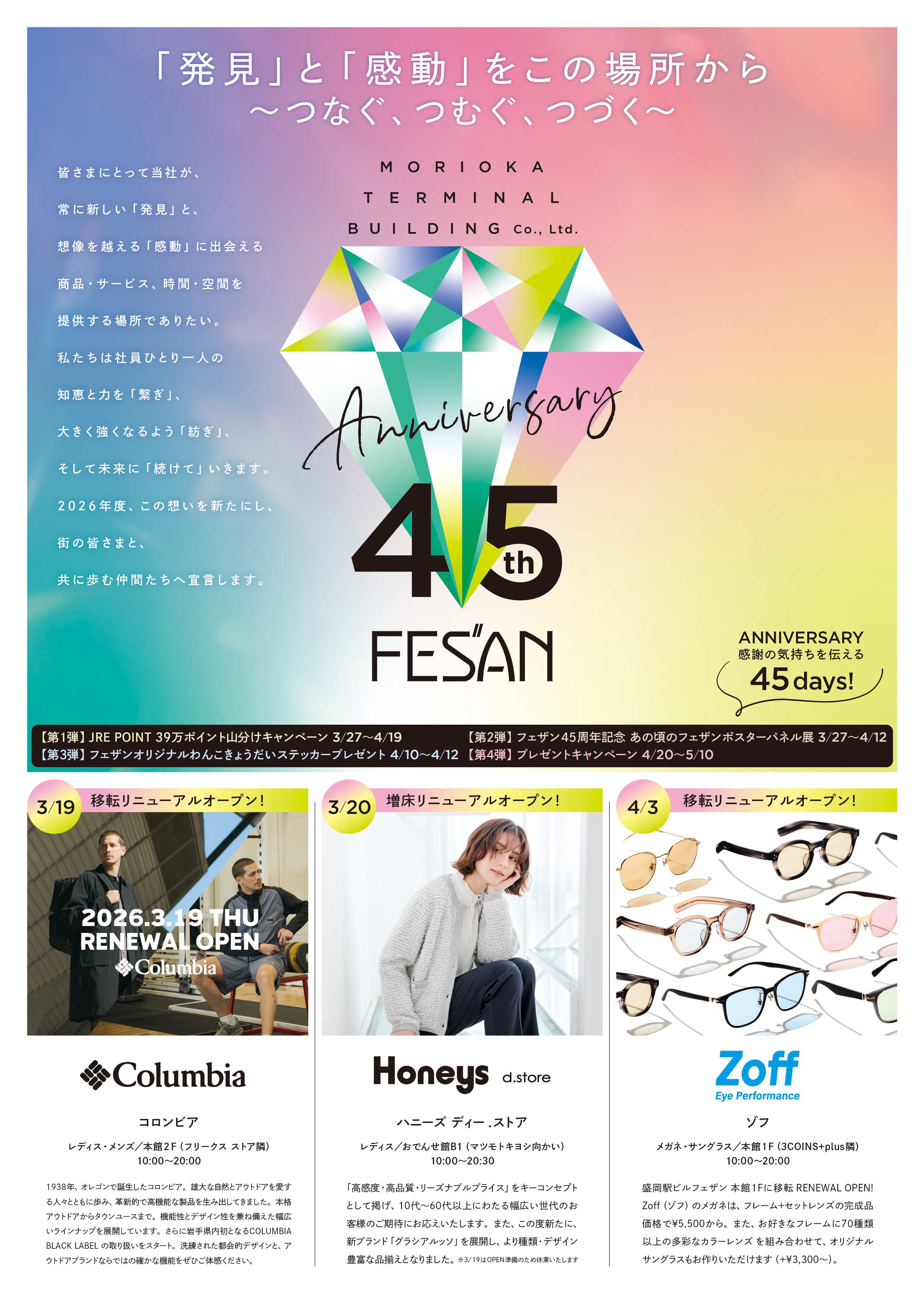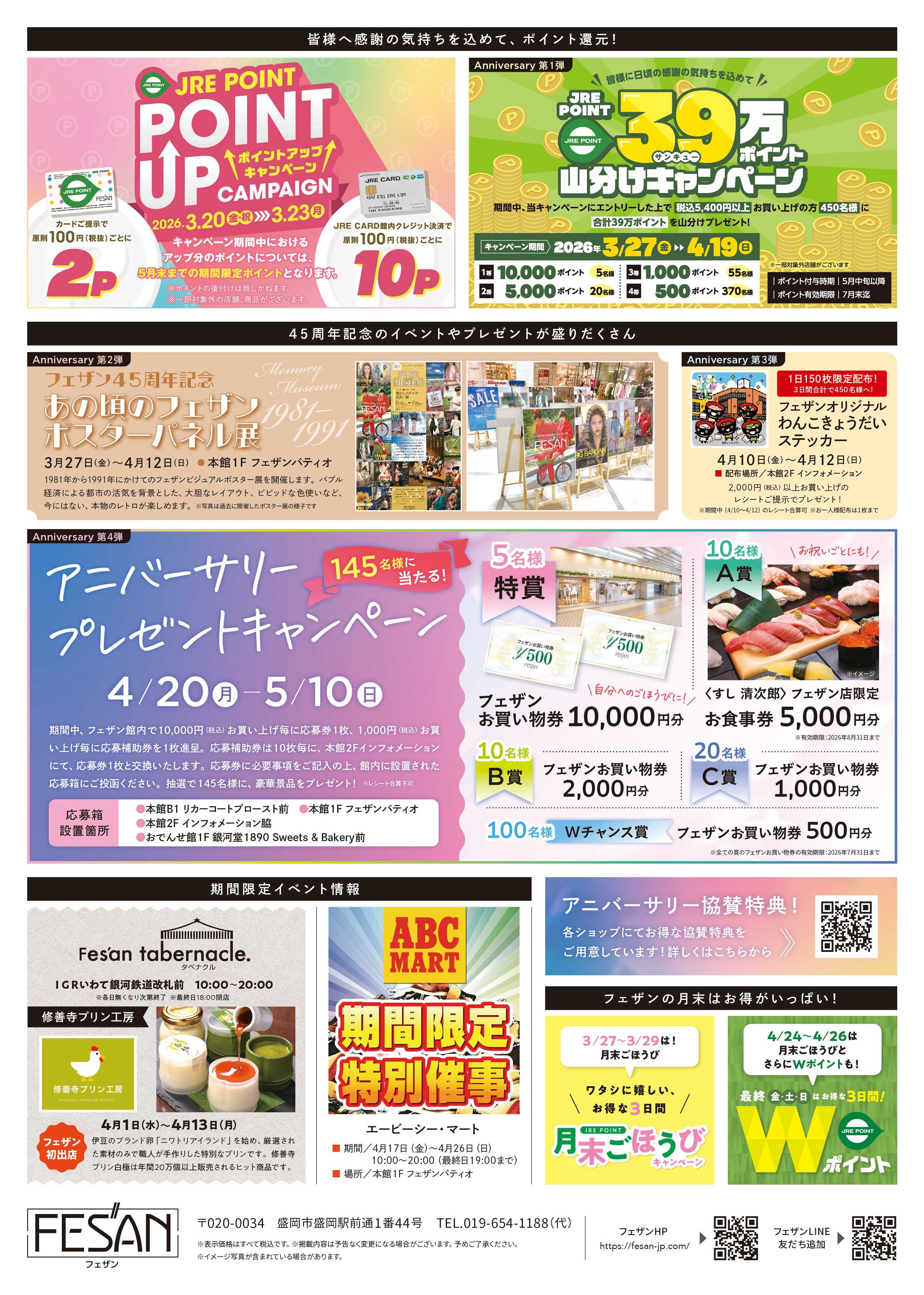 おかげさまでフェザンは45周年を迎えます。感謝の気持ちを込めて、3/27~楽しいイベント・キャンペーンを開催いたします🎉