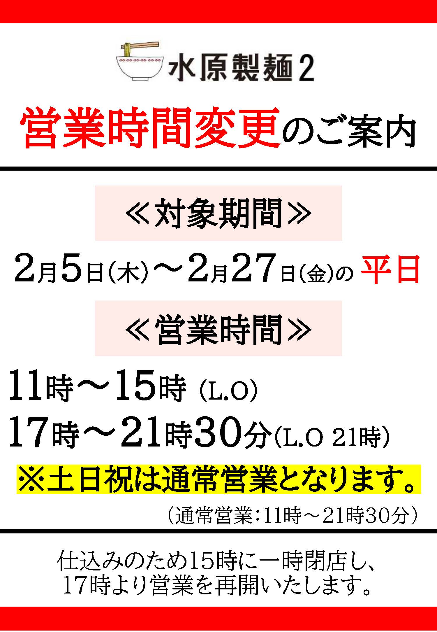 2月5日(木)より以下の期間において、食材準備や仕込み時間確保のため営業時間を変更させていただきます。