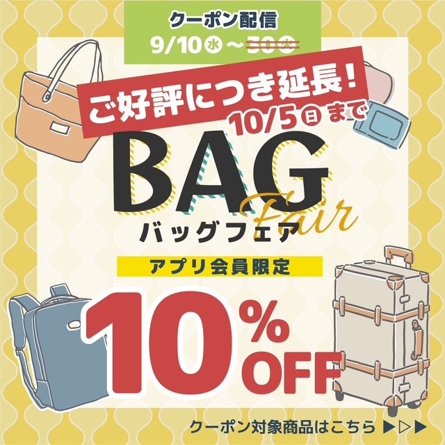 9/10から開催中のバッグフェアが、ご好評につき10/5(日)まで延長!