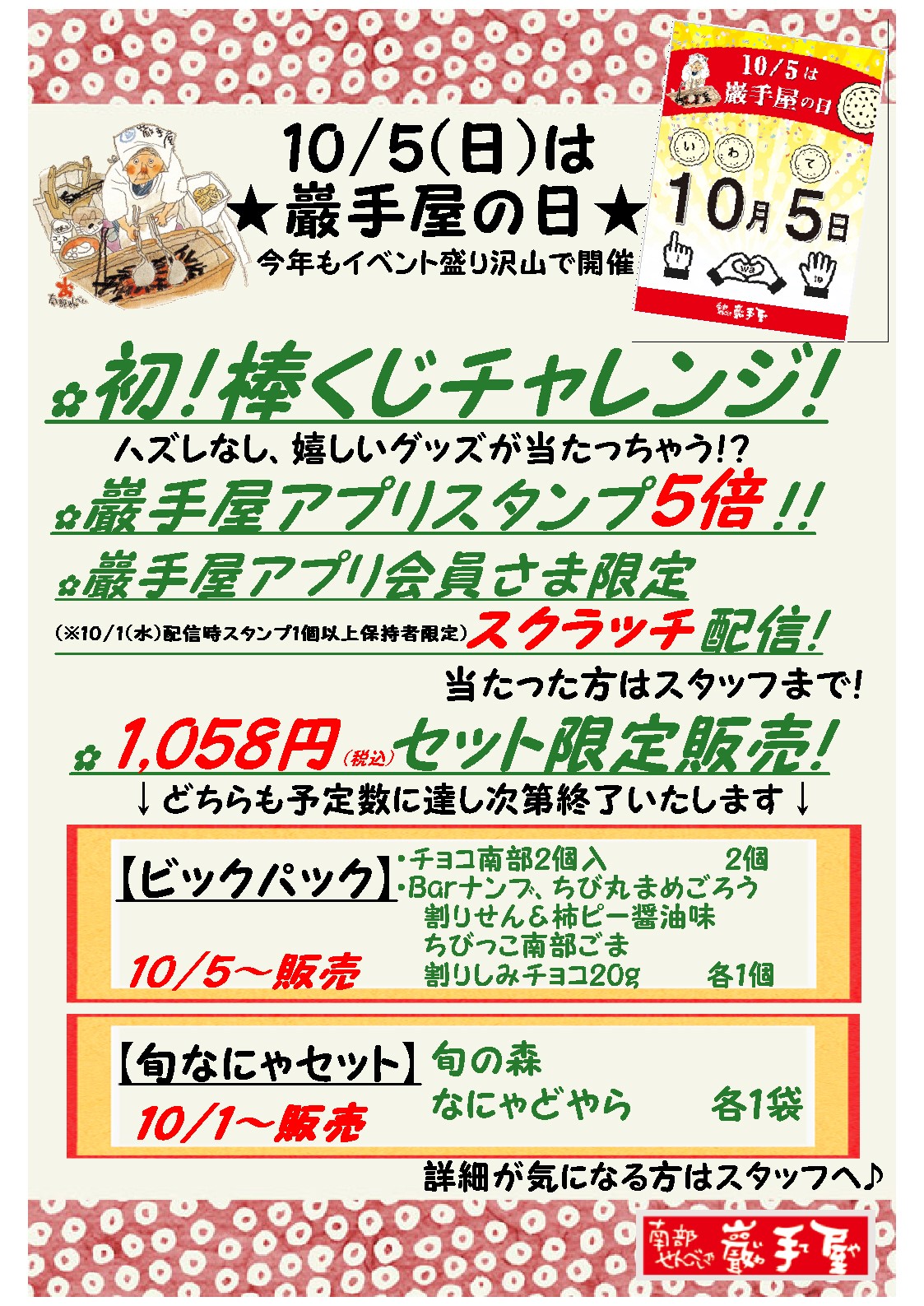10月5日(日)は巖手屋の日[南部せんべい乃 巖手屋]