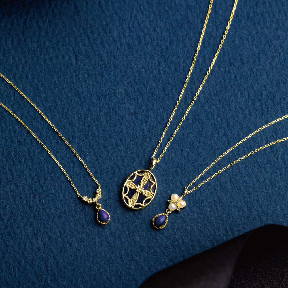 深い青に、夜の静寂ときらめきを映すラピスラズリを使用しています。
