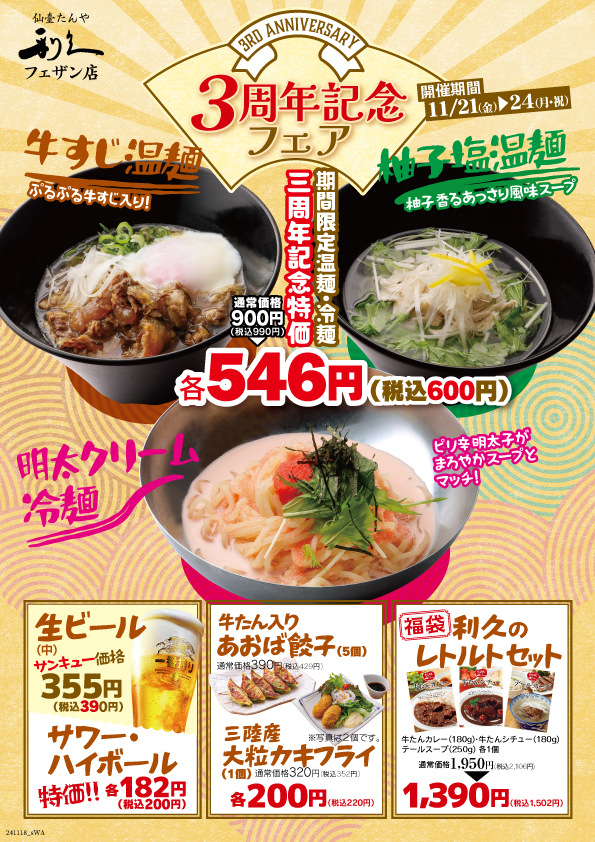 【仙臺たんや利久フェザン店3周年記念フェア開催】