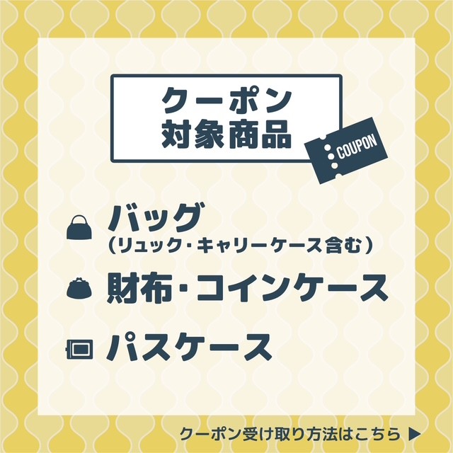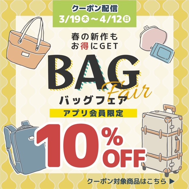 3/19(木)〜4/12(日)の期間中、アプリ会員様限定でバッグ・財布・パスケースを対象に10%OFFクーポン配信中!