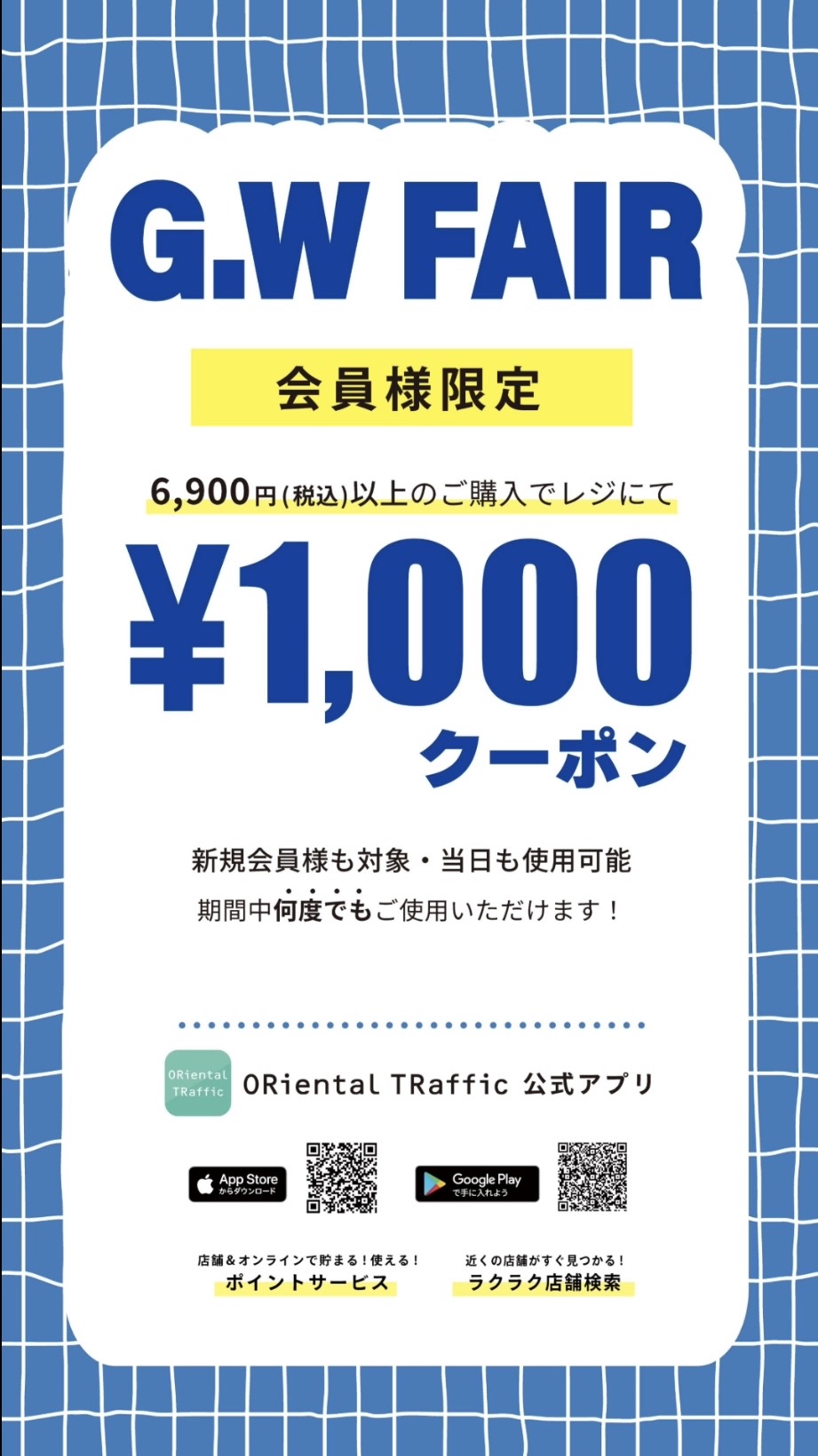 税込6,900円以上のお買い上げで1会計で1回1,000円OFF